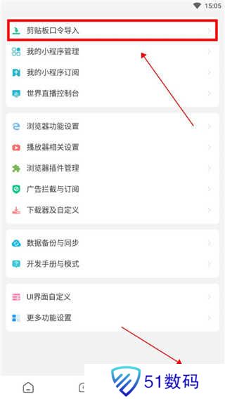 1、下载好app后,点击进入右下角的设置,在这里选择【剪辑版口令导入】。