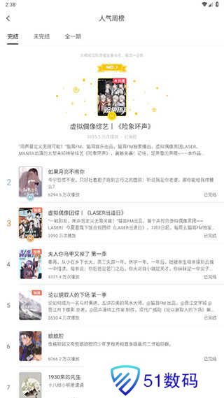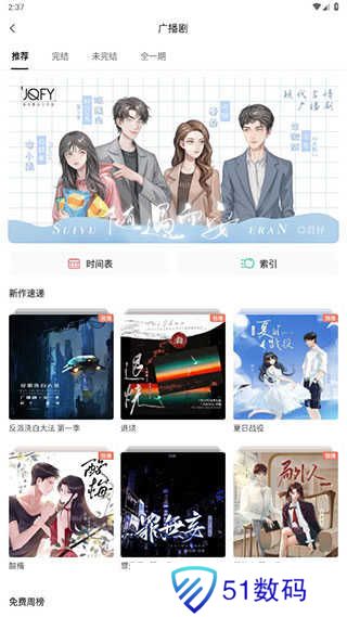 2、进入广播剧单元,这里有推荐、玩家、未完结、全一期等板块供用户选择