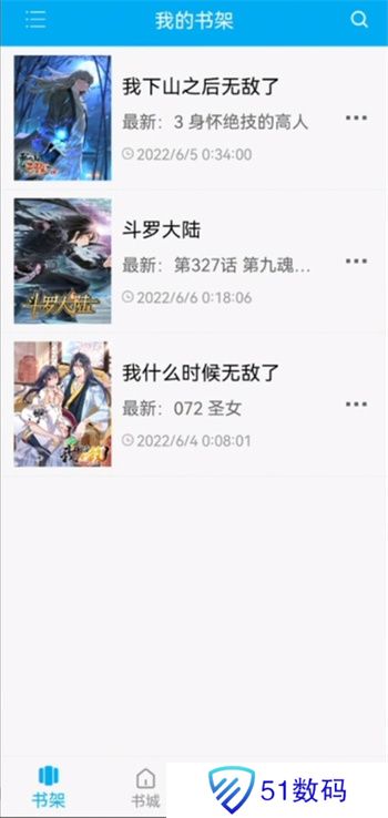 1、首先一进入这里就是软件的首页,在这里可以看到自己的书架里所收藏的书籍,快速找到自己想要观看的动漫;