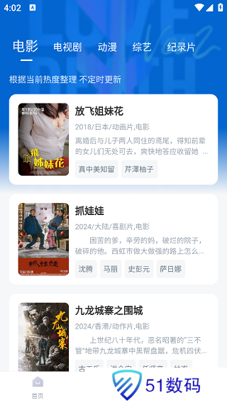 4、点击下方菜单栏中的“排行榜”板块,这里对庞大的资源进行了排行管理,方便用户轻松了解当下热门的电影、电视剧、动漫等。