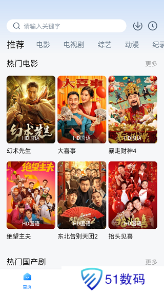 1、打开手机中的蓝光影院,在首页中可以看到当前热门的电影、国产剧、动漫、综艺等,统统免费观看。
