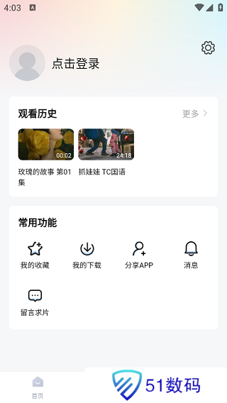 5、切换到“我的”界面中,在这里可以查看到自己的观看历史、下载、收藏等内容。