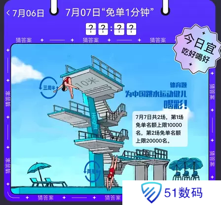 今天小编给大家带来的是饿了么免单一分钟7.7的答案详细介绍,今天的题目和昨天的题目相比之下就明显简单了很多,也很好猜测准确的免单时间了。今天的题目和跳水运动有关,那么就让小编来给大家带来准确的预测时间吧。