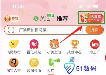 第一步打开淘宝,在淘宝首页可以看到【大赢家】的小图标,点击进入;