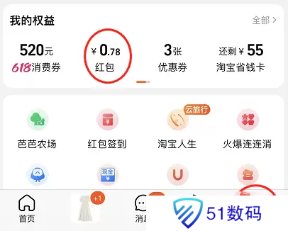 1、进入淘宝,点击右下角的【我的淘宝】,在我的权益这一栏可以看到【红包】;
