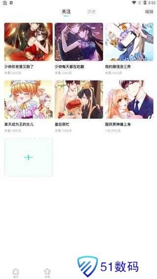 6、喜欢的漫画可以添加关注,点击历史还可以看到最近看过的漫画;