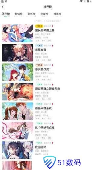 3、点击排行榜,这里有飙升榜、畅销榜、热度榜等多种榜单,当你不知道看什么漫画的时候,可以来这挑挑;