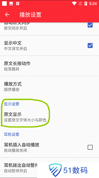 3、在这里找到“显示设置”的“原文显示”,点击进入;