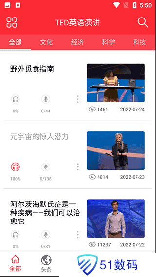 TED是一款专注于英语学习和教育的软件,通过提供来自世界各地的思想领袖和各领域专业人士的高质量演讲,使用户能够深入了解科技、娱乐及设计等领域的最新发展。这款应用不仅帮助用户快速积累相关话题下的词汇、句型和表达,还通过智能视频断句、单句跟读加原音对比重现等功能,大大提升用户的英语听力和口语能力。