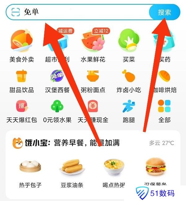 1、在饿了么app首页搜索框中输入“免单”然后点击搜索,即可进入今日饿了么免单活动界面。