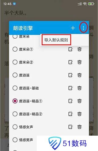 提示:如果你发现你的朗读引擎里没有这么多可选的,请点击此界面右上角的三个点,选择‘导入默认规则’后即可