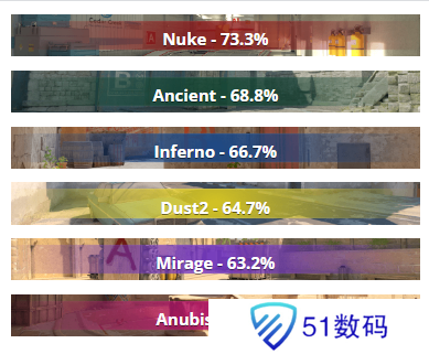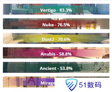 在近六次交手中,两支队伍的交手地图相对固定:Mirage出现6次、Ancient出现四次,Nuke出现四次,Anubis和Dust2各出现两次。Vertigo是Spirit在近半年胜率最高的地图,为83.3%,其次是Nuke,为76.5%,第三是Dust2,为70.6%。
