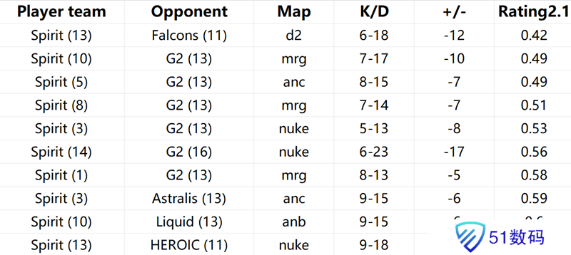 Leonid Vishnyakov | chopper经常被直播间吐槽是吉祥三宝,但如果从数据看,吉祥三宝在对阵G2时的发挥也不尽相同。尤其是magixx似乎尤其被G2战队所克制。笔者查看了Spirit战队选手今年倒数十张地图数据(数据截止到上海Major揭幕战阶段开始之前)。如果各位仔细查看,会发现五位选手的十差地图数据中G2占比不尽相同。chopper为四张地图,作为指挥这样的数据完全能够接受。zont1x为三张图,是不是有些意外?zont1x在面对G2时很多时候还是宗主。