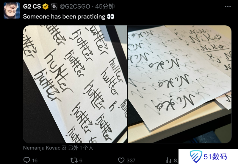 而G2官方也分享了波黑兄弟NiKo和huNter-两人练习签名的草稿纸。鉴于本次Major,V社要求选手在5-10秒内完成签名设计,因此职业哥们都在提前打磨自己的签名。