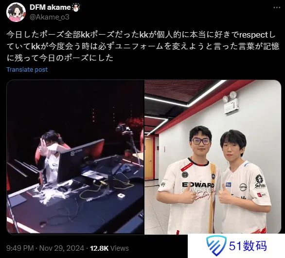 DFM选手akame在胜者组决赛战胜PRX后,在社交媒体发文并配图表示:我今天做的所有手势都是康康的手势,我个人非常喜欢和尊重康康,而且他说了下次见面我们一定要交换队服,所以我记住并且在今天比了他的手势。