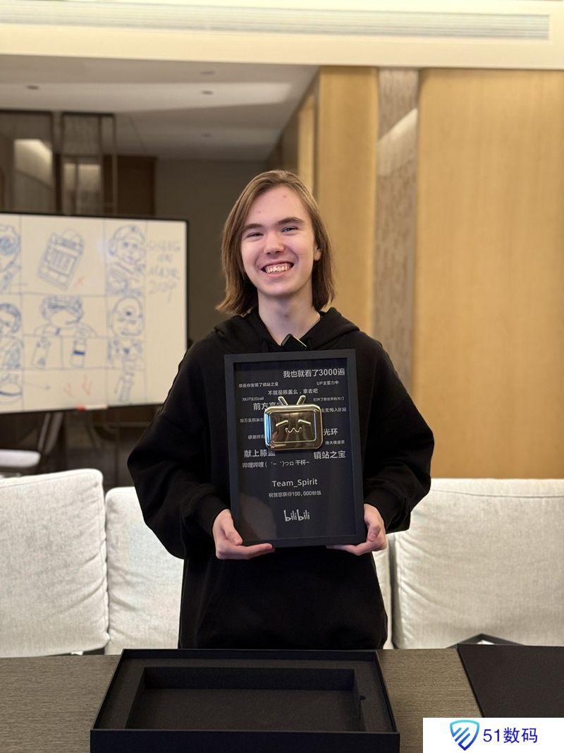 而达成10万粉丝成就之时,b站也给Spirit俱乐部寄来了专属奖牌。Spirit队内的明星选手donk负责了快递拆封工作。