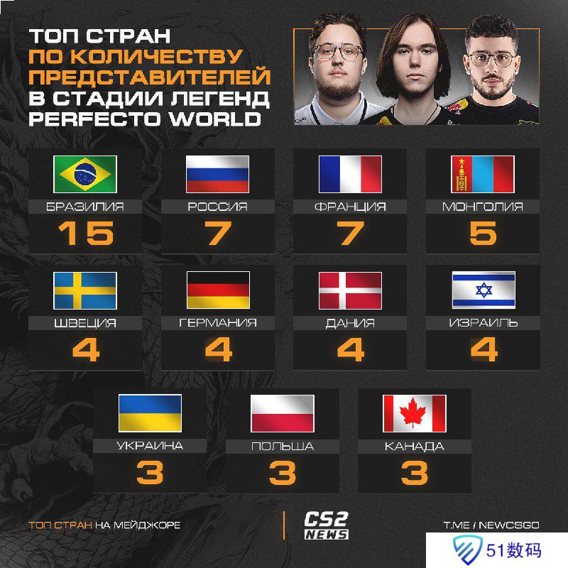 以下为上海Major正赛阶段各国职业选手人数排行榜: