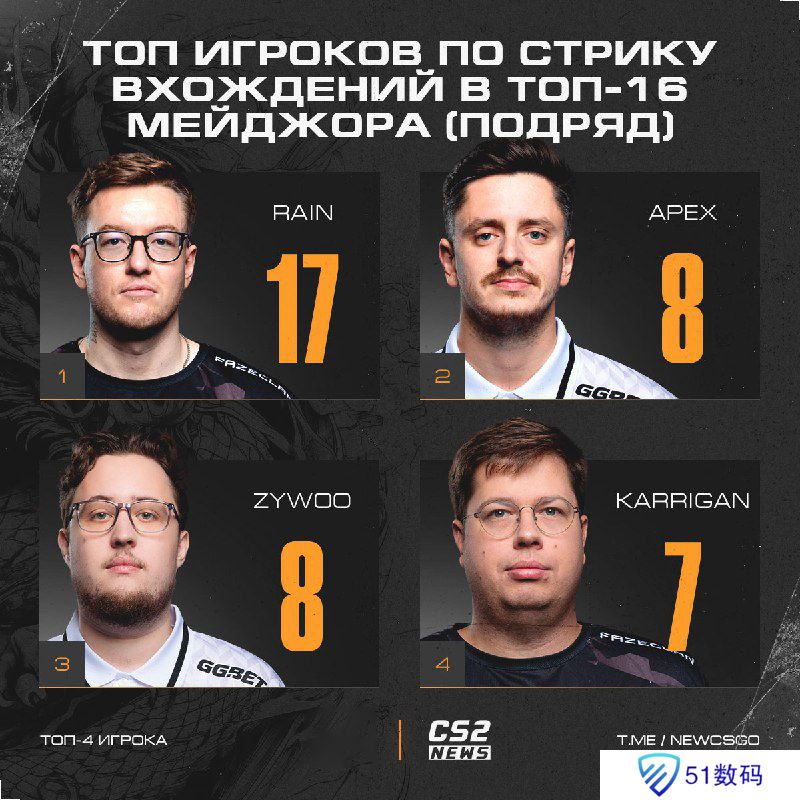 此外,apEX和ZywOo连续打进Major 16强共8次,排在二人之后的是现FaZe指挥karrigan,连续打进传奇组16强阶段7次。