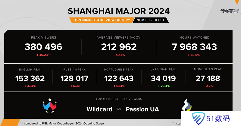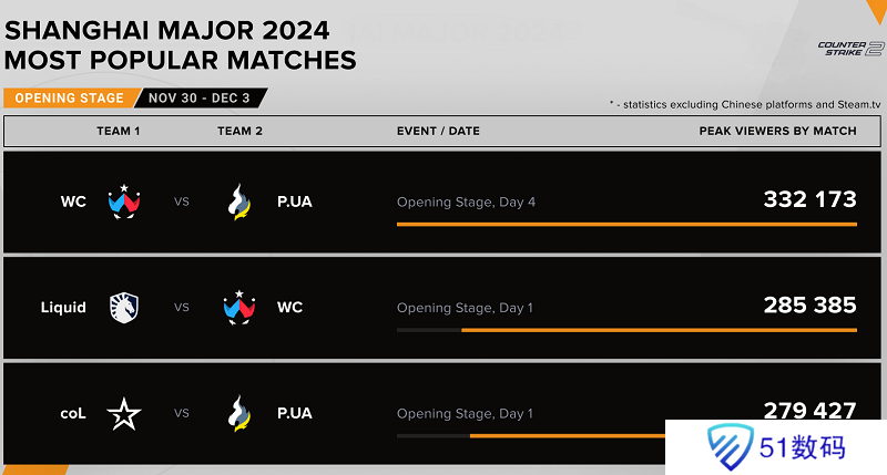 Passion UA,最高同时在线观众人数超过32.5万。总体而言,比起2024哥本哈根Major,中国观众数量较少,但淘汰赛阶段的情况可能会有所改变。