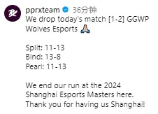 2024上海电竞大师赛无畏契约项目,PRX以1-2的比分不敌WOL,无缘决赛。赛后,PRX官方发文告别本次赛事。
