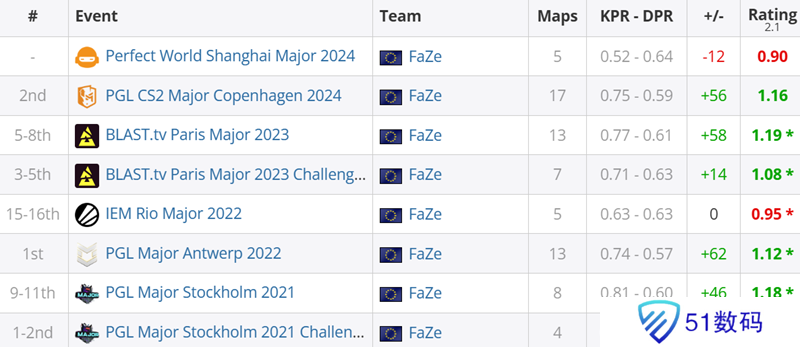 他本人一共参加了八届Major,之前最差的一次是2022年的IEM 里约Major,仅有0.95 rating。但这次上海Major到目前为止他的赛事rating只有0.90。