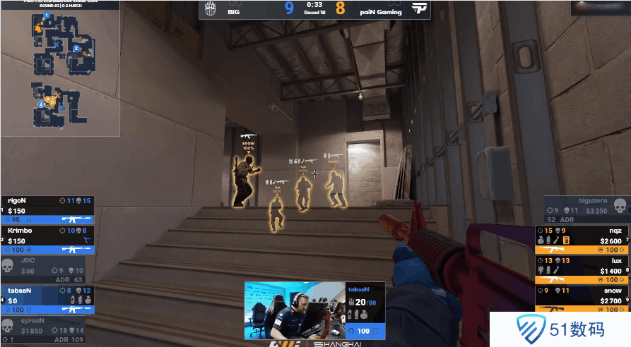 在第18回合中,tabseN选择绕后,在他面前的是paiN战队众多队员的背身。但台下的观众难掩激动,引发的声浪让paiN战队选手snow回头查看并击杀了tabseN。而对此tabseN也颇为无奈。最终paiN 13-10拿下了这张图。