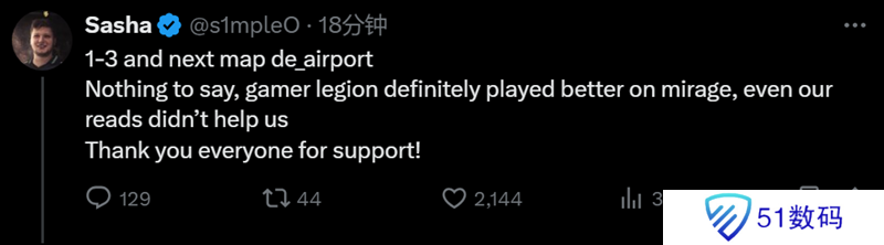 GamerLegion被淘汰。赛后s1mple分享了自己的感受。