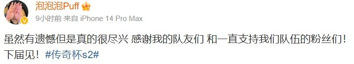 赛后Puff发文:“虽然有遗憾但是真的很尽兴,感谢我的队友们,和一直支持我们队伍的粉丝们!下届见!”