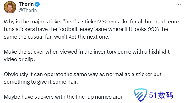 “为什么Major赛事的贴纸只能是一张贴纸呢?除了那些铁杆粉丝以外,选手贴纸就像是足球队的队服一样,如果它跟之前的贴纸对比看起来99%都一样,那普通粉丝可能就没兴趣继续消费了。