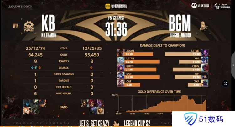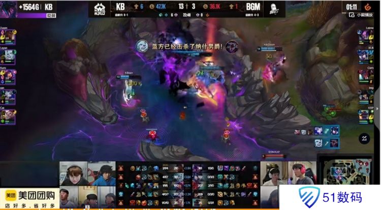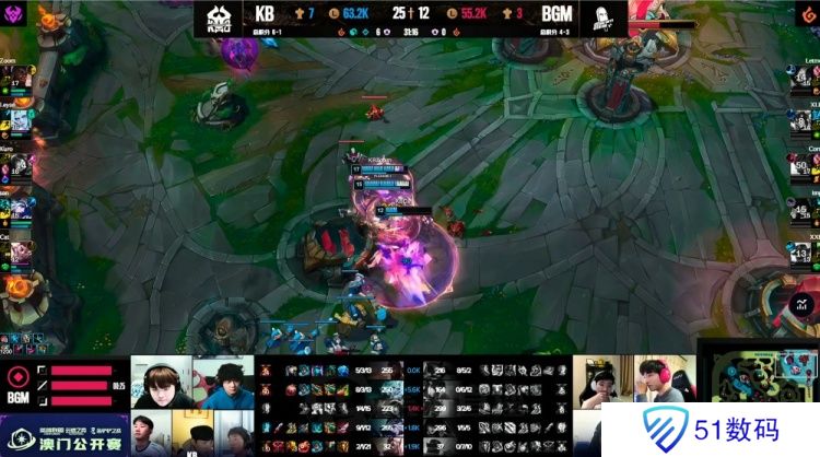 【25:03】Kuro妮蔻闪现大招开团但是KB过于集结,Letme凯南大招电了个爽!KB推掉了中路高地,但是BGM打出2换5团灭KB,但是Leyan佛耶戈直接抢掉了第四条小龙!BGM野辅直接倒下!随后高地团又是Letme凯南和Corn永恩配合再次秒掉了Leyan佛耶戈!这波BGM又击杀了KB三人,再次守住一波!经济差只有6K了!