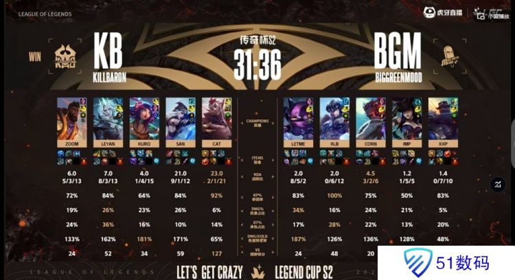 KB:上单Zoom、打野Leyan、中单Kuro、下路San、辅助Cat