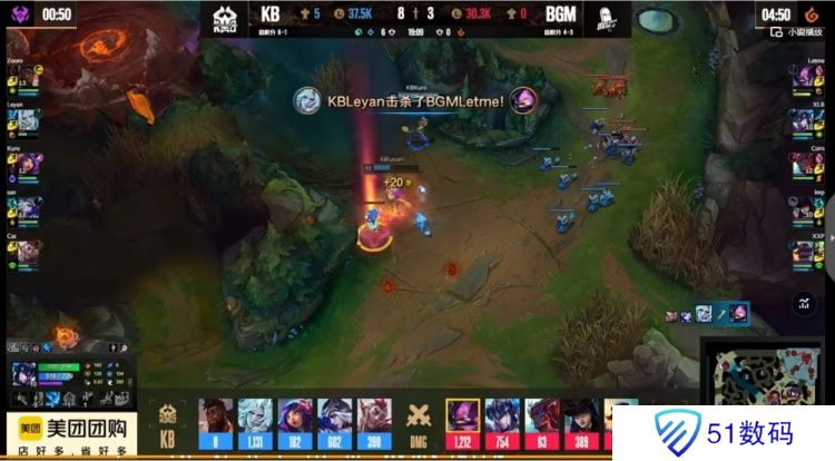 【19:08】KB开小龙,XLB猪妹一个大招命中Leyan佛耶戈拼惩抢下小龙,但是KB追击再次收掉了Letme凯南!8K经济差!