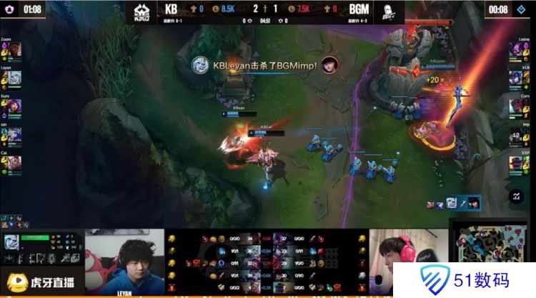 【21:26】Letme凯南在上路吃到san艾希一箭,被Kuro妮蔻跟上控制秒掉!KB开打大龙,xxp布隆大三个但是直接没秒!Corn永恩Q3+R想进场找san艾希,但是被捡到布隆魂的Leyan佛耶戈晕住,也白给了!KB追击留住Imp女警,打了个3+1,一波0换4之后回头再开大龙!XLB猪妹还想进场但是龙已经被Leyan佛耶戈惩掉了!KB追击再次打出0换3!