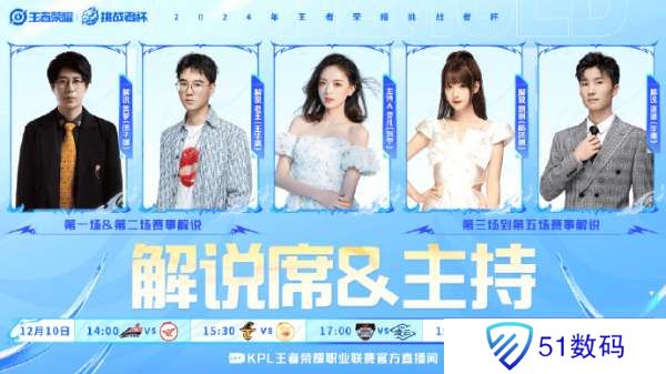 解说席&主持人:解说美梦 (闵子端)、解说老王ww (王华斌)、灵儿chili (刘宁)、解说琪琪 (杨泽琪)、解说潇洒洒 (李潮)