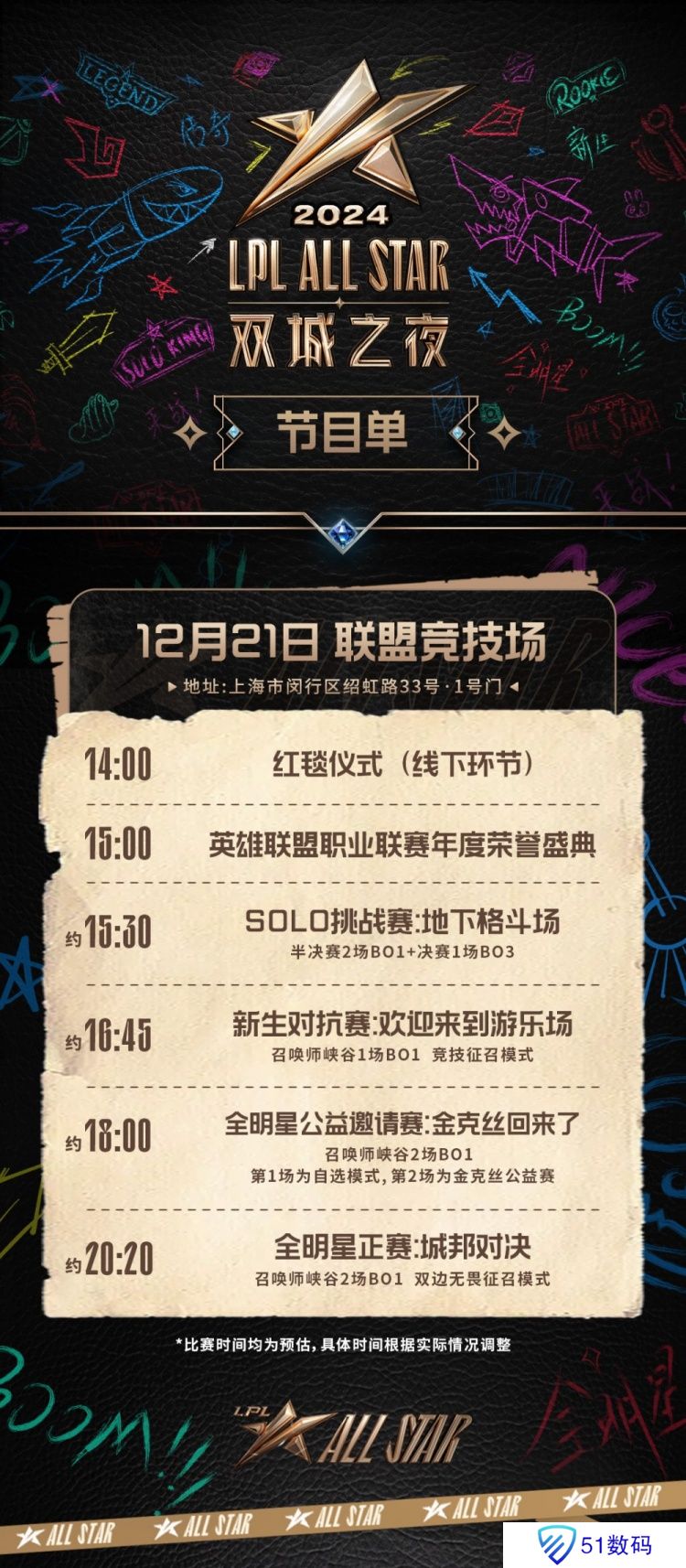 直播吧12月11日讯 2024英雄联盟职业联赛全明星-双城之夜将于12月21日举行。全明星-双城之夜日程安排以及节目单如下: