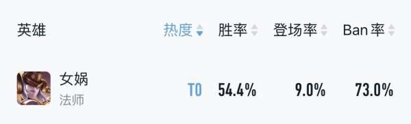 新版女娲重做后成功起飞,近期巅峰赛54.4%胜率+73%禁用率,强度已经属于断档T0的存在。