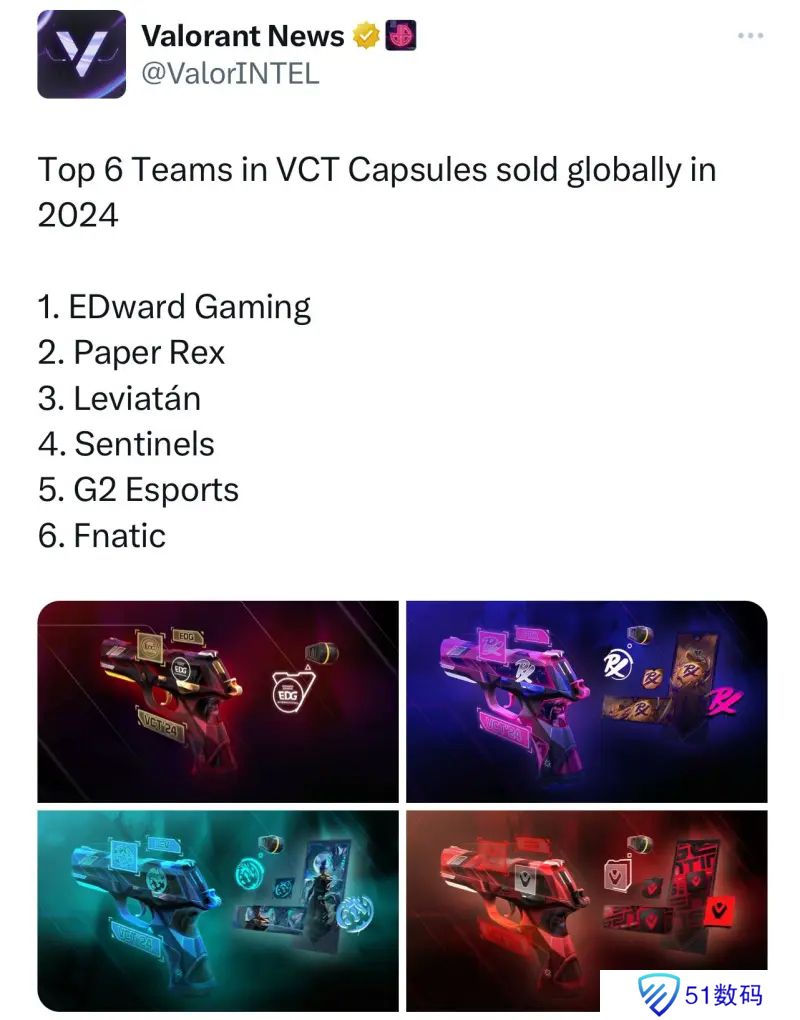 外网媒体Valorant News爆料2024年战队捆绑包的销量前六名,同时该媒体提到,此排名经过了无畏契约电竞主管的确认。