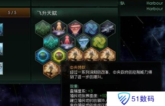 又要提醒一点,一段飞升和机器人升级并不同,机器人升级是学会了对应技能之后自动升级的,瞬间且无任何消耗。但是一段飞升,当你点了“血肉皮囊”这个飞**赋后并不会有任何反应,仅仅在任务区出现一个工程学的任务,任务所需要的工程点数取决于你的人口,你需要暂停当前的工程学院研究,使用点数去完成这个任务,只有完成后才算真正完成了一段飞升。所以人口越少,进行飞升所需要的时间和消耗越少。