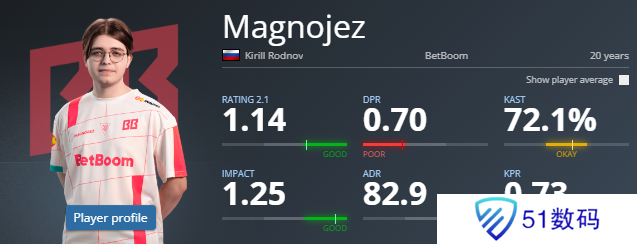 而说到Magnojez,曾经nafany在采访中对他的表现赞不绝口。在过去的一年中他有着1.14的rating,Impact数据上也相当亮眼。如果他能成功加入C9,相信对于队伍火力上具有一定的补强效果。