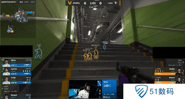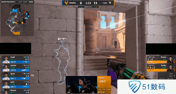 下半场Vitality来到进攻方,手枪局五人集合从外场展开进攻,最后形成三楼夹A阵型,一波冲击轻松拿下胜利。次回合FaZe选择ECO。