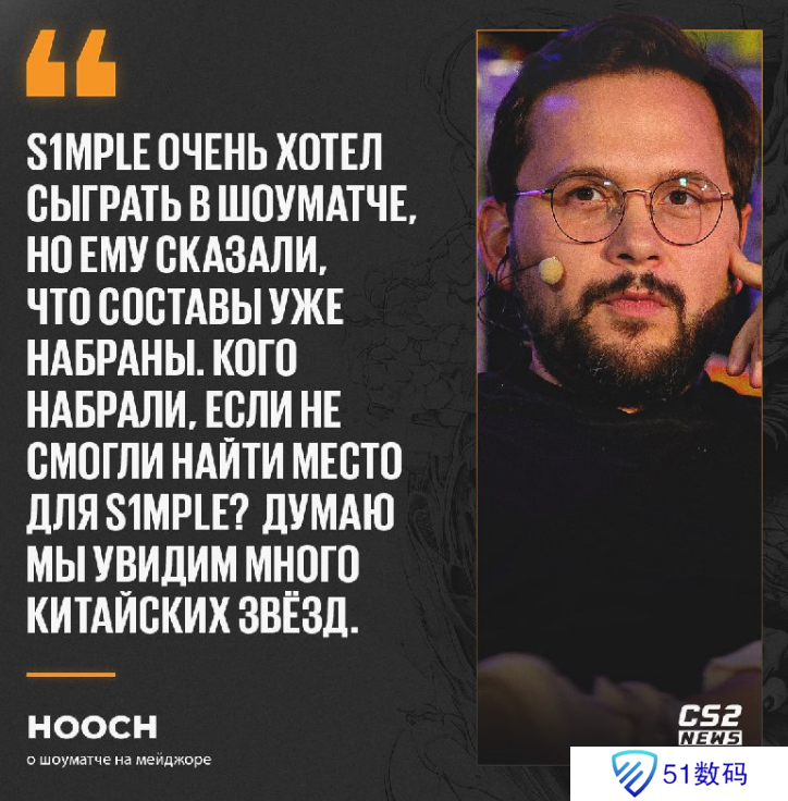 “s1mple很想参加Major表演赛,但是主办方告诉他说表演赛阵容已经确定好了。不知道他们会找谁呢?我觉得会是很多中国明星选手。”