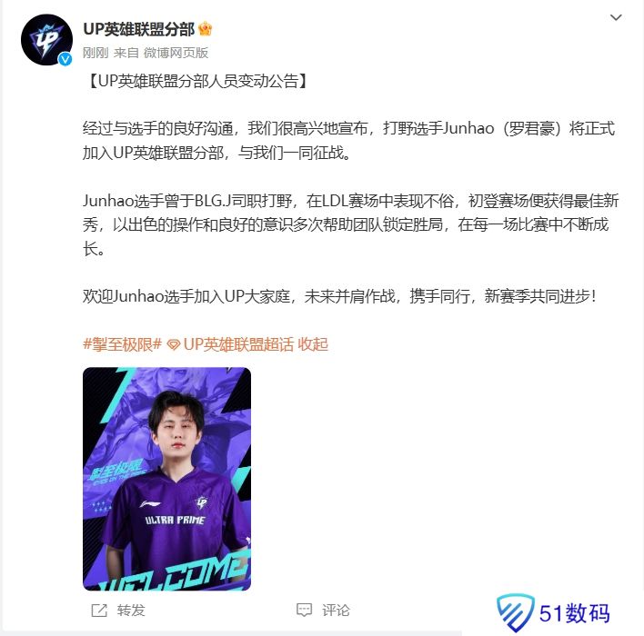 UP俱乐部官方:前BLG二队打野Junhao将正式加盟担任下赛季首发!