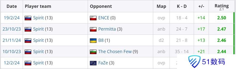 而在这场比赛中,Spirit队员donk打出了2.46 Rating、21-8 K-D、147.9 ADR的职业生涯第三高单图数据: