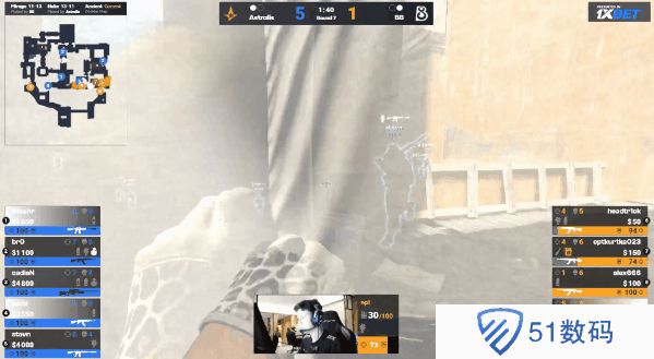 图一为B8选择的Mirage,先作进攻方的他们手枪局顺利拿下之后,A队强起局B8也取得胜利,比分来到3-0。第四局,jabbi在B小拿下首杀,随后B8想要进攻B区被A队轻松接住,A队拿下第一分。但很快下一局B8就强起翻盘,好在第六局,A队拿下了3v3回防,他们取得第二分。这分过后B8想要再次拱门包夹A区,但由于枪械劣势,这次进攻被A队轻松化解,B8还进入了eco局,A队追平比分。第九局,Staehr A1前顶拿足信息,并且击杀了单摸的土匪,随后拱门的stavn和B小的点子哥均拿下击杀,B8想要夹B的战术也告破,A队拿下第五分。第十一局,中路双方对枪B8完成2换3,人数优势的他们随即上拱门进攻A区终于拿下下半场第五分。上半场结束,A队以7-5暂时领先。