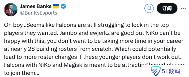 “看来Falcons仍在艰难地争取锁定心仪的顶级选手。Jambo和ewjerkz表现不错,但NiKo对此恐怕不会满意。年近28岁,没人想在职业生涯中再花时间从头组建阵容。要是这些年轻选手表现不佳,很可能会导致阵容进一步变动。Falcons有NiKo和Magisk,本应能吸引备受瞩目的选手加入…… ”