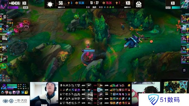 本场比赛前期KB拿下经济优势,但是中期直接开送被SG一度将经济差拉回到2K!不过的关键大龙团前Kakao卡兹克被抓,Leyan佛耶戈在龙坑里配合队友收割完成超神,随后的远古龙团xiaocaobao加里奥落单失误被秒,KB拿下第二条大龙+远古龙,三龙汇一波结束比赛,拿下第九胜!