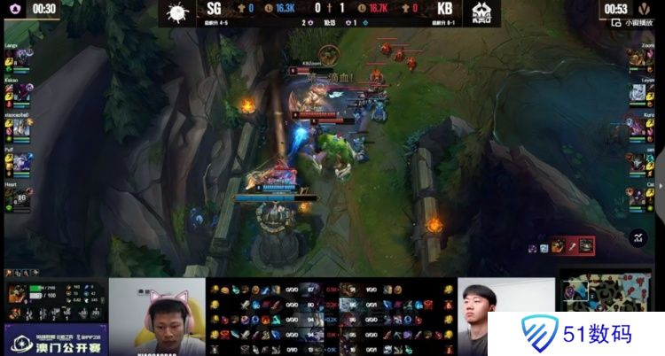 【17:20】上路KB五越三成功,用Cat牛头一条命换掉了SG三人!Leyan佛耶戈再次双杀!KB拿到5K经济优势!