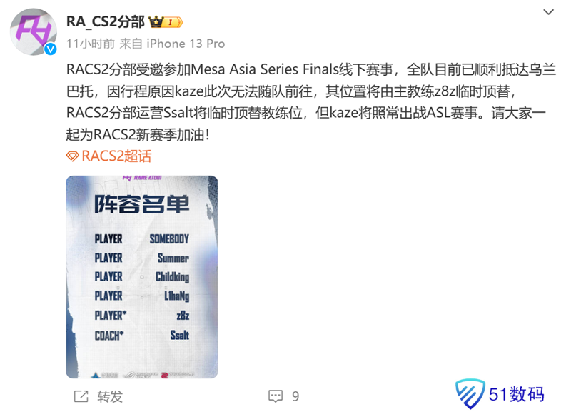 “RA CS2分部受邀参加Mesa Asia Series Finals线下赛事,全队目前已顺利抵达乌兰巴托,因行程原因kaze此次无法随队前往,其位置将由主教练z8z临时顶替,RA CS2分部运营Ssalt将临时顶替教练位,但kaze将照常出战ASL赛事。请大家一起为RA CS2新赛季加油!”