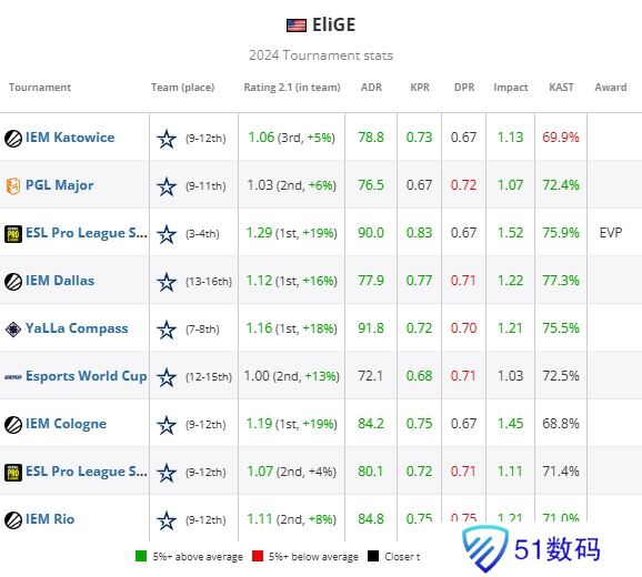 EliGE凭借今年出色的数据表现跻身2024年最佳选手的榜单。他的数据甚至连TOP20中的大多数选手都望尘莫及,例如1.16 Rating(TOP6)、1.12的大赛Rating(TOP13)、0.77 KPR(TOP4)、84.5 ADR(TOP4)、1.09 胜局KPR(1.09)、110.2 ADR(TOP2)。