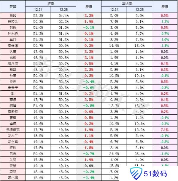 总结:本次对抗路虽然加上了传送,但第一天还并没有开发出来,所以胜率变化不大很正常,但减速的削弱,让关羽变强了也是明显能看出来的,姬小满第一天数据不理想,但潜力巨大,大家可以多多关注,白起目前是胜率最高的英雄,赶紧去玩吧。